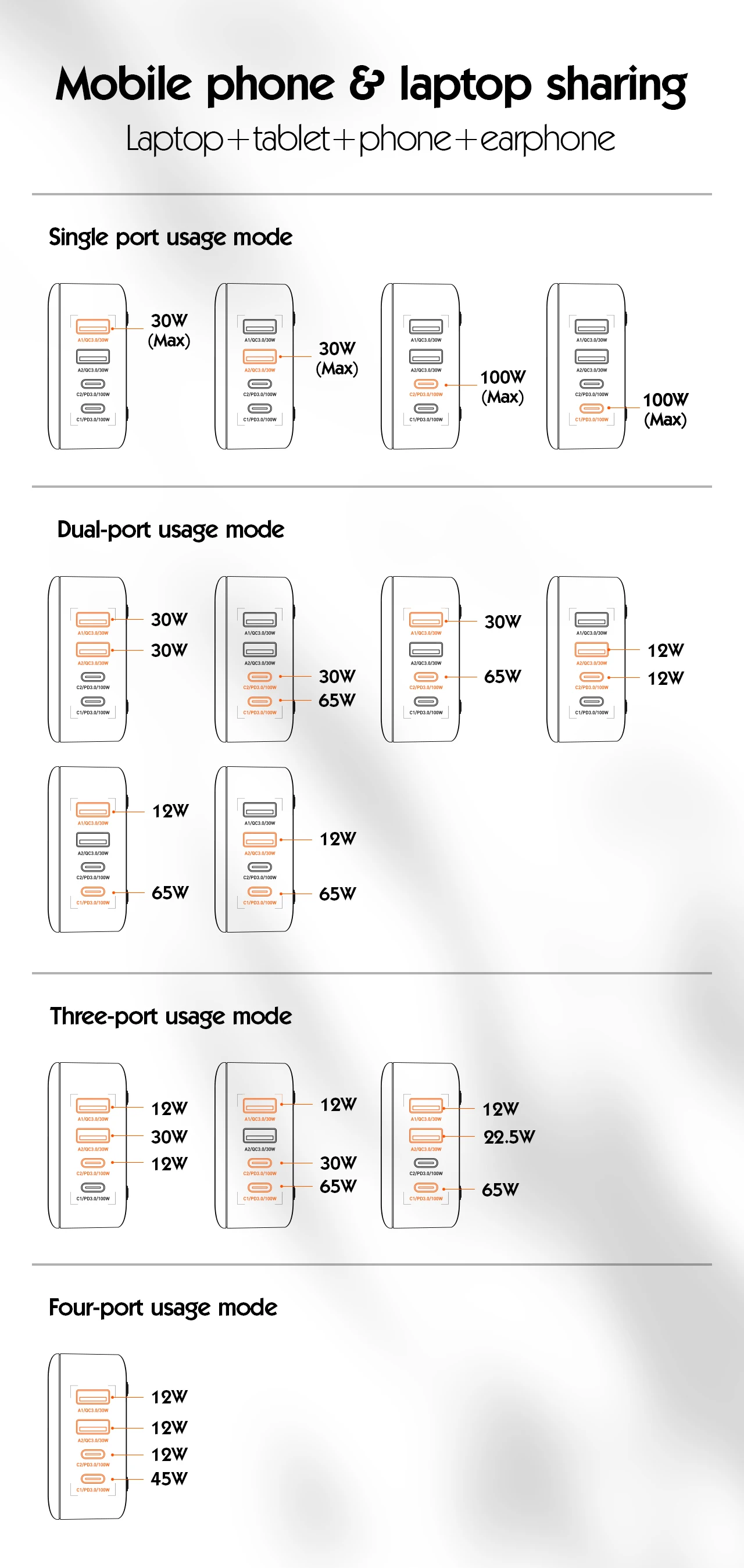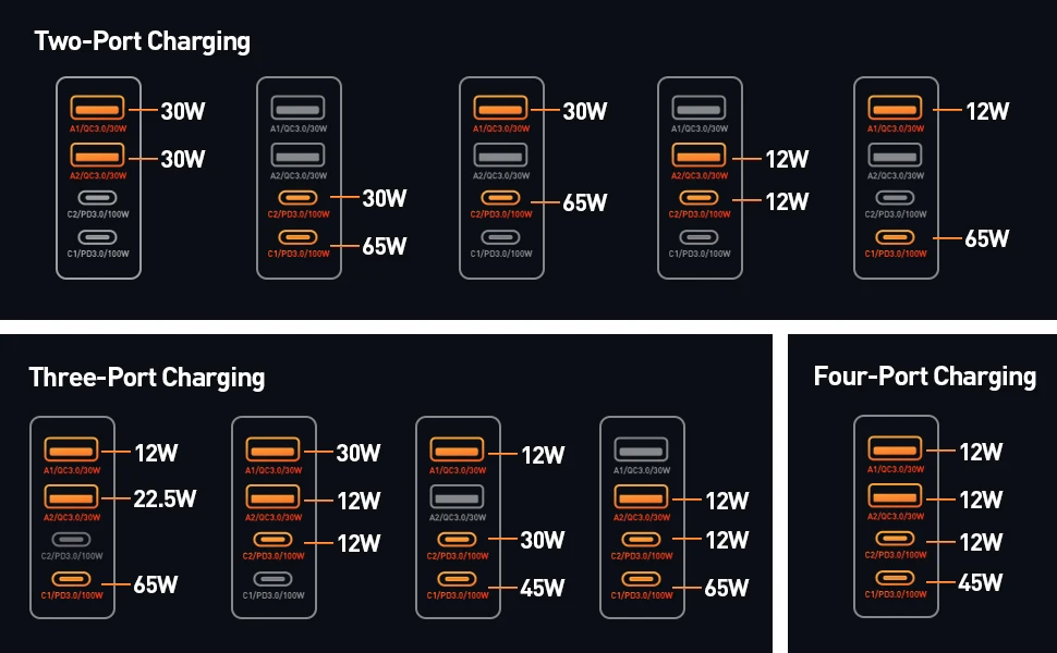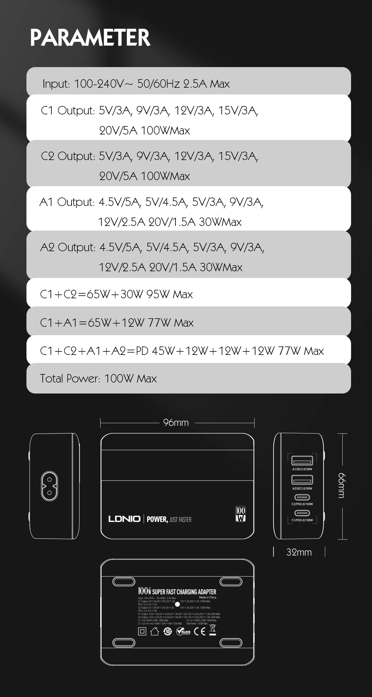 A2 Output:4.5V/5A,5V/4.5A,5V/3A,9V/3A,12V/2.5A,20V/1.5A 30W MAX