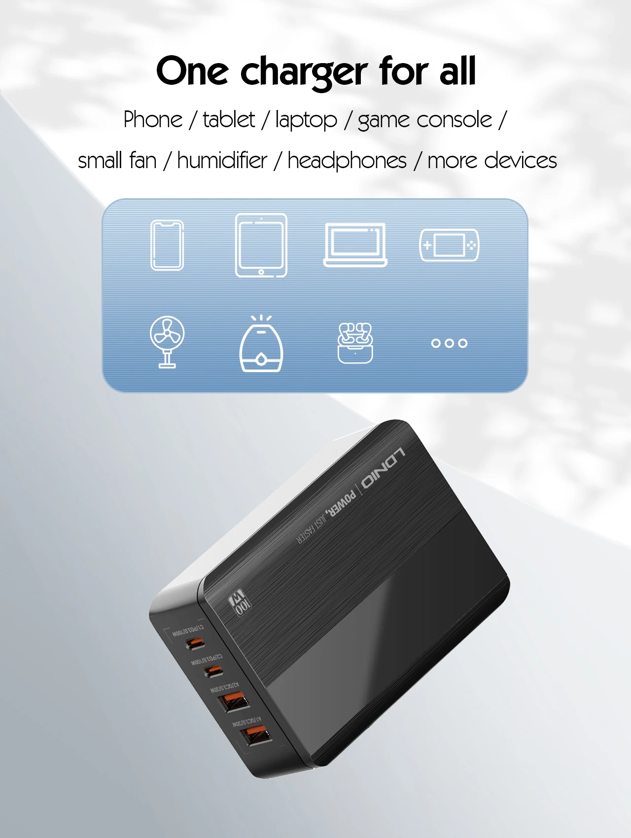 One charger for all Phone / tablet / laptop / game console /small fan / humidifier /headphones / mere devices