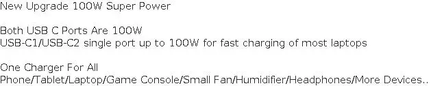 USB-C1/USB-C2 single port up to 100w for fast charging of most laptops